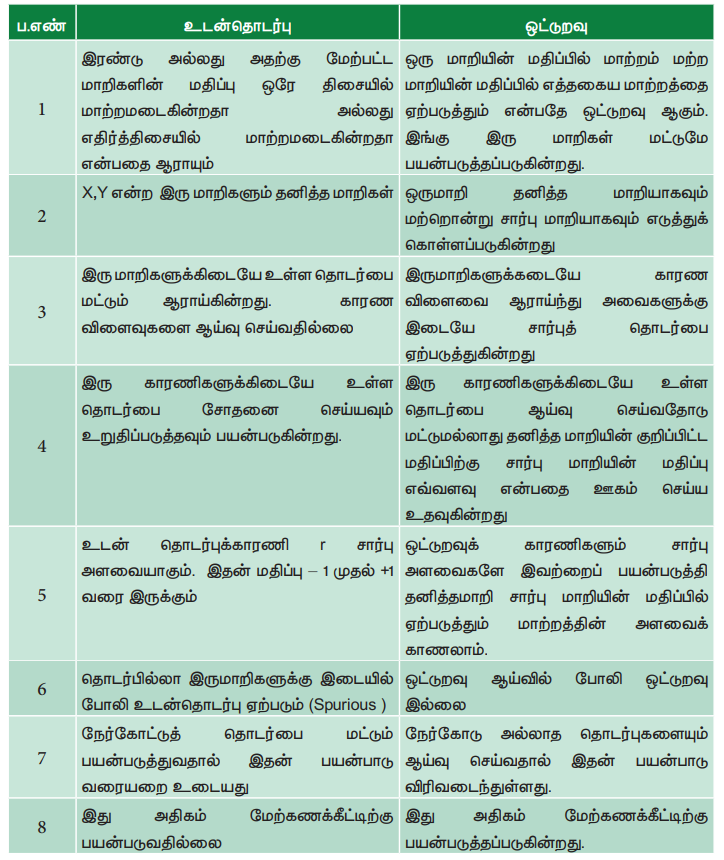 1. ஒரு மாறியின் மதிப்பில் மாற்றம் மற்ற மாறியின் மதிப்பில் எத்தகைய மாற்றத்தை ஏற்படுத்தும் என்பதே ஒட்டுறவு ஆகும். இங்கு இரு மாறிகள் மட்டுமே பயன்படுத்தப்படுகின்றது.