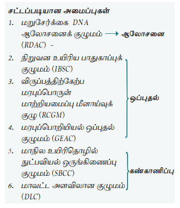 மரபியல்பு மாற்றப்பட்ட உயிரிகளின் (GMOs) உற்பத்தி மற்றும் உயிரிய தொழில்நுட்பப் பொருட்களின் உற்பத்தி, விற்பனை மற்றும் பொருட்கள் ஆகியவை சில நெறிமுறைகளுக்குட்பட்டதாகும். மரபியல்பு மாற்றப்பட்ட உயிரிகளின் உற்பத்திப் பொருட்களை கவனமாக ஆய்வுக்கு உட்படுத்தப்பட்டு ஆவணப்படுத்துவது அவசியம். மரபியல்பு மாற்றப்பட்ட உயிரிகளை அடையாளப்படுத்தி, பயன்பாட்டு வழிமுறைகளுக்கு ஏற்ப பயன்படுத்த வேண்டும். இத்தகு நெறிமுறைகள் மக்கள் உயிரினங்கள் மற்றும் சுற்றுச்சூழலை பாதுகாக்க உருவாக்கப்பட்டதாகும். இந்திய உயிரிய தொழில் நுட்ப நெறிப்படுத்து ஆணையம் (BRAI) (Bio technology Regulatory Authority of India), மரபியல்பு மாற்றப்பட்ட உயிரிகளை உள்ளடக்கிய உயிரிய தொழில்நுட்பவியல் வழி (GMOs) உற்பத்திப் பொருட்கள் பயன்பாட்டை நெறிப்படுத்த உருவாக்கப்பட்ட அமைப்பாகும். இந்திய வனங்கள், சூழ்நிலை மாற்றம் சுற்றுச்சூழல் அமைச்சகத்தின் ஆளுகையில் உள்ள மரபுப்பொறியியல் ஒப்புதல் குழுமம் (Genetic Engineering Approval Committee - GEAC), நம் நாட்டில் மரபுப்பொறியியல் உற்பத்திப் பொருட்களுக்கு ஒப்புதல் அளிக்கும் அமைப்பு ஆகும். மசோதா ஏற்பளிக்கப்பட்டால், உயிரிய தொழில் நுட்பவியல் நெறிப்படுத்து ஆணையத்தின் துணைப்பிரிவான சுற்றுச்சூழல் மதிப்பீட்டுக் குழு (Environmental Appraisal Panel) பொறுப்பேற்கும். மேலும், அமைச்சகங்களுக்கு இடையிலான BRAI செயல்பாடுகளை மேற்பார்வை செய்யும் அமைப்பை உருவாக்கிட இம்மசோதா முன்மொழிகின்றது. உயிரிய தொழில்நுட்ப உற்பத்தி பொருட்கள் மற்றும் உயிரிகளை சமுதாயத்துக்குள் நுழைத்தல், அவற்றின் பயன்பாட்டின் பின்னூட்டம் அளிப்பது ஆகியன தேசிய உயிரிதொழில்நுட்ப ஆலோசனைக்குழுமப் பங்குதாரரின் பணிகளாகும். சட்டப்படியான தன்னாட்சி நிறுவனமான நெறிப்படுத்து அமைப்பு உயிரிய தொழில்நுட்ப உற்பத்திப் பொருட்கள் மற்றும் உயிரிகளைப்பற்றி ஆராய்ச்சி, இறக்குமதி, போக்குவரத்து மற்றும் உற்பத்தி ஆகியனவற்றை நெறிப்படுத்துகின்றது. மாநில உயிரிய தொழில் நுட்ப ஒருங்கிணைப்புக் குழுமம் (State Biotechnology Co ordination Committees – SBCC) மற்றும் மாவட்ட அளவிலான குழுமங்கள் (District level Committee) ஆகியன GEAC க்கு உதவி புரிவனவாகும். நிறுவன உயிரிய பாதுகாப்புக் குழுமம் (The Institutional Biosafety Committees - IBSC) உள்ளூரில் வழிமுறைகளை நடைமுறைப்படுத்தும் அமைப்பு ஆகும். மரபணு மாற்றப்பட்ட பொருட்களை வர்த்தக ரீதியாக, பெருமளவில் பயன்படுத்த அனுமதி அளிப்பது, விருப்பத்திற்கேற்ப மரபுப்பொருள் மாற்றியமைப்பு மீளாய்வுக்குழு (Review Committee on Genetic Imanipulation (RCGM) வின் பணியாகும். IBSC மற்றும் RCGM ஆகியவை மிக முக்கிய அமைப்புகளாகும். இவற்றை கண்காணிப்பது மரபுப்பொருள் ஒப்புதல் குழுவின் (GEAC) பொறுப்பாகும்.