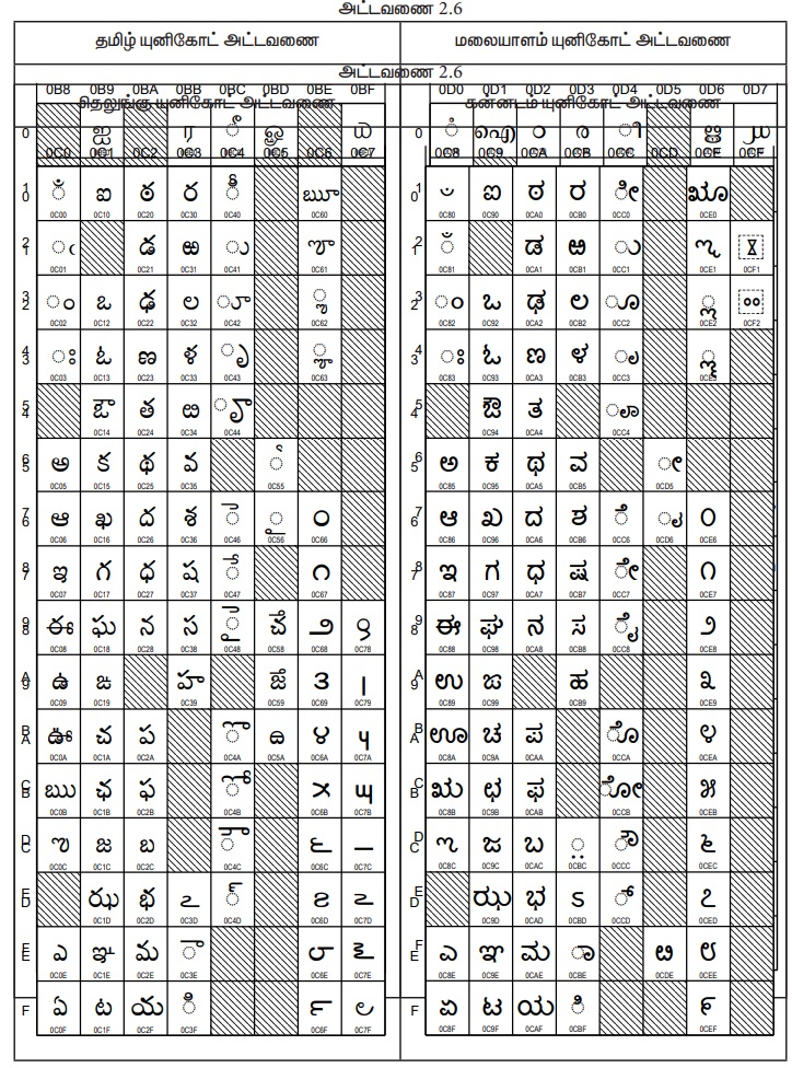 பதினாறு நிலை எண் முறையில் குறியிடப்படுகின்றது. தமிழ், தெலுங்கு, மலையாளம் மற்றும் கன்னடத்தின் யுனிகோட்
