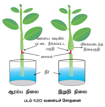 ஒரு கட்டைத் தன்மை கொண்ட தாவரத்தில் சைலத்தினை தவிர்த்து வாஸ்குலக் கேம்பியத்தின் வெளியமைந்த அனைத்துத் திசுக்களையும் (பட்டை, புறணி மற்றும் ஃபுளோயம்) நீக்கவேண்டும். தற்போது சைலம் மட்டுமே வளையத்திற்கு இருபுறம் உள்ள மேல் கிழ் தாவரப் பகுதிகளை இணைக்கிறது. இந்த அமைப்பினை நீர் நிரம்பிய பீக்கருக்குள் வைக்க வேண்டும். சிறிது நேரம் கழித்து வளையத்தின் மேற்புறம் உணவுபொருட்கள் சேகரமாவதால் அப்பகுதி வீங்கியிருப்பதைக் காணலாம் (படம் 11.20). இச்சோதனை சிலநாட்கள் தொடர்ந்து நடைபெற்றால் முதலில் வேர்கள் இறக்கும். இதற்குக் காரணம் ஃபுளோயம் அகற்றப்படுவதால் வேருக்குச் உணவு தடைபடுகிறது மேலும் வேர்களினால் உணவைத் தயாரிக்க இயலாததாலும் வேர் இறக்கிறது. தண்டுப் பகுதி சாறேற்றத்திற்காக வேரை நம்பி இருப்பதால் வேர் இறந்த உடன் தண்டும் இறுதியாக இறக்கிறது.