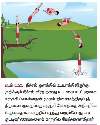 கோண உந்த மாறா விதியின் தத்துவமானது பல சூழ்நிலைகளில் பயன்பாட்டில் உள்ளது. மிகச் சிறந்த உதாரணமான ஐஸ் நடனக் கலைஞரின் சுழற்சி விளையாட்டு படம் 5.27 இல் காட்டப்பட்டுள்ளது. நடனக் கலைஞர் தன்னைத் தானே சுழற்றும் போது அவரது கைகளை வெளிப்புறமாக நீட்டினால் சுழலும் வேகம் குறைகிறது. ஏனென்றால் கைகளை உடலுக்கு வெளிப்புறமாக நீட்டும் போது நிலைமத்திருப்புத்திறன் அதிகரிப்பதால் கோணத்திசைவேகம் குறைந்து சுழலும் வேகம் குறைகிறது. கைகளை உடலை நோக்கி உட்புறமாக மடக்கும் போது நிலைமத்திருப்புத்திறன் குறைவதால் சுழலும் வேகம் அதிகரிக்கிறது.
