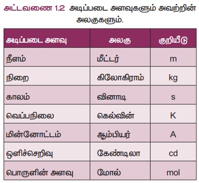 units) உள்ள ன. அவை அடிமான அலகுகள் (base units) என்றும் வழங்கப்படுகின்றன. அவை அட்டவணை 1.2ல் கொடுக்கப்பட்டுள்ளன.