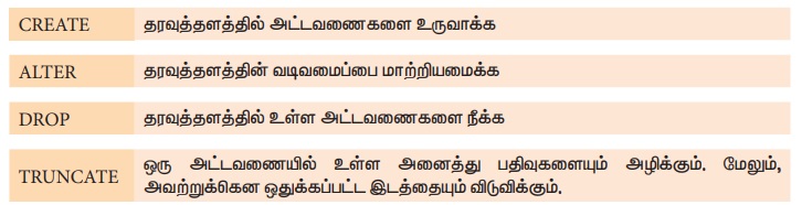தரவு வரையறை மொழியின் கீழ்வரும் SQL கட்டளைகள் பின்வருமாறு: