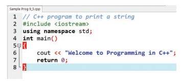 “Welcome to Programming in C++” எனும் சரத்தை அச்சிடும் நமது முதல் C++ நிரல் காண்போம்.