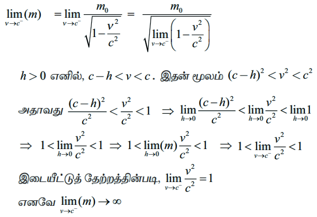 இங்கு m0 என்பது ஆரம்ப நிறை மற்றும் c என்பது ஒளியின் வேகம். v → c− எனில் m−ல் ஏற்படும் மாற்றம் என்ன? ஏன் இடதுபக்க எல்லை அவசியம்?