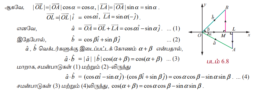 என்ற அலகு வெக்டர்கள் x−அச்சின் மிகை திசையுடன் முறையே α, β என்ற கோணங்களை ஏற்படுத்துகிறது என்க. இங்கு A, B என்பன படம் 6.8−ல் காட்டப்பட்டுள்ளன. AL மற்றும் BM என்பவற்றை x−அச்சுக்கு செங்குத்தாக வரைக.