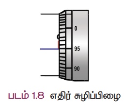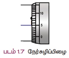 திருகு முனையின் சமதளப் பரப்பும், எதிரேயுள்ள குமிழின் சமதளப்பரப்பும் இணையும்போது தலைக்கோலின் சுழிப்பிரிவு புரிக்கோலின் வரைகோட்டிற்குக் கீழ் அமைந்தால் அது நேர் சுழிப்பிழை எனப்படும். எடுத்துக்காட்டாக தலைக்கோலின் 5 வது பிரிவு புரிக்கோலின் வரைகோட்டுடன் இணைந்துள்ளது (படம் 1.7). எனவே, இது நேர் சுழிப்பிழை எனப்படும்.