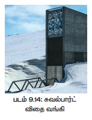 இ) சுவல்பார்ட் விதை வங்கி: விதைகள் நான்கடுக்கு மூடிய உறைகளில் இடப்பட்டுப் பின்னர் அவை அடர்ந்த திடமான நெகிழி கொள்கலன்களில் வைக்கப்பட்டு, உலோக அலமாரிகளில் அடுக்கப்படுகிறது. இவ்விதை சேமிப்பு அறைகள் -18°C வெப்ப நிலையில் வைக்கப்படுகின்றன. குறைந்த வெப்பநிலையும் வரையறுக்கப்பட்ட ஆக்ஸிஜனும் விதையின் வளர்சிதை மாற்றத்தையும் ,வயதாவதைத் தள்ளிப்போடுவதையும் உறுதி செய்கின்றன. மின்சாரம் தடைபடும் பொழுது விதைகளுக்குத் தேவையான குறைந்த வெப்பநிலையைக் கொள்கலனைச் சுற்றியுள்ள நிலத்தடி உறைபனியானது வழங்குகிறது