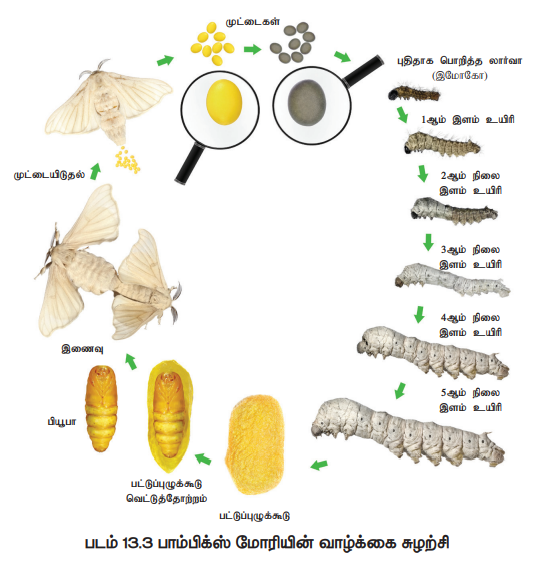 1, 2, 3 மற்றும் 4வது தோலுரித்தலின் பின்பு பட்டுப்புழுவானது, முறையே 2, 3, 4 மற்றும் 5வது இடைநிலை புழுக்களாக (instars) மாறுகின்றன (படம் 13.3). இதற்கு பொரித்த நாளிலிருந்து 21 முதல் 25 நாட்கள் ஆகின்றன. முழுமையாக வளர்ச்சியடைந்த பட்டுப்புழுவானது 7.5 செ.மீ நீளத்துடன் உள்ளது. இப்புழுவின் உமிழ்நீர் சுரப்பிகள் நன்கு வளர்ந்தபின், கூட்டுப்புழுவாக மாறத்தயாராகிறது. இதற்காக, இவை உணவு உண்பதை நிறுத்திவிட்டு இலையின் ஒரு மூலைக்குச் சென்று, அவற்றின் உடலில் உள்ள பட்டுச்சுரப்பியின் மூலம் ஒட்டும் தன்மையுள்ள திரவத்தைச் சுரக்கிறது. இவ்வாறு உற்பத்தி செய்யப்பட்ட திரவமானது கீழ்த் தொண்டைப் பகுதியிலுள்ள சிறிய துளையில் உள்ள ஸ்பின்னரெட் என்னும் பின்னும் அமைப்பின் வழியே வெளியேறுகிறது. இவ்வாறு நூல் போன்று வெளிவரும் திரவமானது காற்றுப்பட்டவுடன் கடினமாகிறது. இந்த இழைகளைக் கொண்டு அது தன்னைச்சுற்றி உறைபோன்ற கக்கூன் எனும் பட்டுக்கூட்டைக் கட்டுகிறது. வெண்மை நிறத்தில் காணப்படும் இக்கூடு அதனுள் உள்ள கூட்டுப்புழுவிற்கு படுக்கையாக உள்ளது. இதன் வெளிப்புற இழைகள் ஒழுங்கற்றும் உட்புற இழைகள் ஒழுங்கானதாகவும் உள்ளன. கக்கூன்உருவாக்குவதற்காகபுழு சுரந்த ஒருதொடர்ச்சியான இழை சுமார் 1000 முதல் 1200 மீட்டர் நீளம் உள்ளது. கூட்டைக் கட்டி முடிக்க 3 நாட்களாகிறது. கூட்டுப்புழுப் பருவமானது 10 முதல் 12 நாட்கள் வரை நீடிக்கிறது. பின் கூட்டை உடைத்துக்கொண்டு முதிர்ந்த பட்டுப்பூச்சியாக வெளியேறுகிறது.