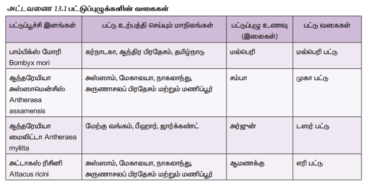 முதல் இரண்டு கூறுகளும் விவசாயத்துறையோடும், மூன்றாவது கூறு தொழில் துறையோடும் தொடர்புள்ளது. பட்டுப்புழு வளர்ப்பில் ஒரு சில பட்டுப்பூச்சி இனங்களே பயன்படுத்தப்படுகின்றன (அட்டவணை 13.1 படம் 13.2)