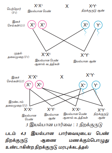 இந்த F1 தலைமுறையைச் சேர்ந்த கடத்திகளாக உள்ள இயல்பான பார்வையுடைய பெண் ஒரு நிறக்குருடு ஆணை மணக்கும்பொழுது F2 தலைமுறையில் ஒரு இயல்பான பார்வையுடைய ஆனால் கடத்தியாக உள்ள பெண், ஒரு இயல்பான பார்வையுடைய ஆண், ஒரு நிறக்குருடு பெண் மற்றும் ஒரு நிறக்குருடு ஆண் ஆகியோர் பிறக்கின்றனர் (படம் 4.4).