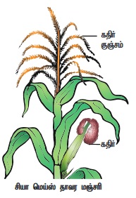 தண்டு நுனி ஆக்குத்திசுவிலிருந்து உருவாகும் நுனி மஞ்சரி மகரந்தத்தாள்களை மட்டும் பெற்ற சிறு மலர்கள் டாசல் (tassel) அல்லது கதிர் குஞ்சம் என அழைக்கப்படுகிறது. கோண மொட்டிலிருந்து உருவாகும் பக்கவாட்டு மஞ்சரி சூலகம் மட்டும் பெற்ற சிறு மலர்கள் கதிர் (ear or cob) என அழைக்கப்படுகிறது. மக்காச்சோளத்தின் ஒருபால் தன்மை கதிர் சிறு மலர்களின் மகரந்தத்தாள் மற்றும் டாசலில் அமைந்த சூலகங்களின் தேர்ந்தெடுக்கப்பட்ட சிதைவின் காரணமாக உருவாக்கப்படுகிறது. இரண்டு தனித்தனியான இணை மரபணுக்களுக்குப் பதிலாக, ba என்ற மரபணு கருவுறாத் தாவரத்திற்கும் (Barren plant) ‘ts’ என்ற மரபணு டாசல் விதைக்கும் (Tassel seed) குறிப்பிடப்படும். இது ஒருபால் தன்மை மற்றும் இருபால் தன்மையின் (அரிதாக) வேறுபாட்டிற்குக் காரணமாக உள்ளது. ஒத்த பண்பிணைவு கொண்ட கருவுறாத் தாவரத்தின் அல்லீல் (ba) பட்டிழைகள் மற்றும் கதிர் மஞ்சரியை நீக்குவதுடன் ஆண் மலர்கள் கொண்ட தன்மையாக மாற்றி விடுகிறது. டாசல் விதைக்கான அல்லீல் (ts) டாசலை மகரந்தம் அற்ற பெண் மலராக மாற்றி விடுகிறது. அது மகரந்தத்தை உற்பத்தி செய்வதில்லை . அட்டவணை 3.7ல் இந்த அல்லீல்களின் சேர்க்கையின் அடிப்படையில் பால்தன்மை வெளிப்பாடு முடிவு கொடுக்கப்பட்டுள்ளது. இந்தப் பெரும்பான்மையான சடுதிமாற்றங்கள் ஜிப்ரெலின் உற்பத்திக் குறைபாட்டினால் ஏற்படுகின்றன. கதிர்களில் காணப்படும் சிறுமலர்களின் மகரந்தத்தாள் ஒடுக்கத்திற்கு ஜிப்ரெலின்கள் முக்கியப் பங்கு வகிக்கிறது.