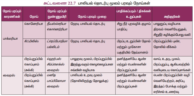 ● பாலியல் தொடர்பு மூலம் பரவக்கூடிய நோய்கள் பற்றிய சில தகவல்கள் அட்டவணை 22.7ல் தரப்பட்டுள்ளன.