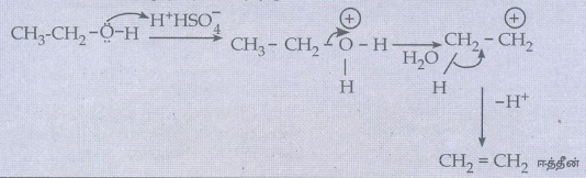 10. எத்தனால் ஆனது அமில வினைவேகமாற்றி முன்னிலையில் நீரகற்ற வினைக்கு உட்பட்டு ஈத்தீனைத் தரும் வினையின் வினைவழிமுறையினைத் தருக.