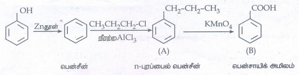 20. பீனாலை Zn துகளுடன் வாலை வடித்து பின் புரப்பைல் குளோரைடுடன் சேர்ந்து பிரீடல் - கிராப்ட் ஆல்கைல் ஏற்ற வினைக்கு உட்படுத்தும் போது சேர்மம் A உருவாகிறது. A வை ஆக்சிஜனேற்றம் அடையச் செய்யும் போது B உருவாகிறது. A மற்றும் B யைக் கண்டறிக.