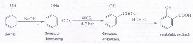 • சோடியம் பீனாக்சைடை 400K மற்றும் 4-7 வளிமண்டல அழுத்தத்தில் அமில நீராற்பகுப்பிற்கு உட்படுத்தும் போது சாலிசிலிக் அமிலம் உருவாகிறது.