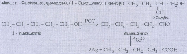 ஃ ஆல்கஹால் C5H11OH , அதாவது பென்டைல் ஆல்கஹால் PCC உடன் ஆல்கஹால் தரும் விளைபொருள் வெள்ளி ஆடி சோதனைக்கு உட்படுகிறது. எனவே விளை பொருள் ஒரு ஆல்டிஹைடு, மேலும் ஆல்கஹால் ஓரிணைய ஆல்கஹால் ஆகும்.