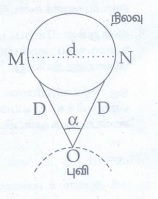 ● புவியில் O என்ற புள்ளியிலிருந்து, தொலைநோக்கி மூலம் நிலவில் முற்றிலும் எதிரெதிரான M மற்றும் N புள்ளிகளை காண வேண்டும். நாம் பார்த்த, அவ்விரு திசைகளிலிருந்து கோணம் α-வை அளந்து கொள்ள வேண்டும்.