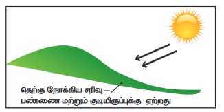 குடியிருப்பின் அமைவிடத்தைத் தீர்மானிக்கும் இரண்டு முக்கியக் காரணிகள் தோற்றம் (Aspect) மற்றும் தங்குமிடம் (Shelter). தோற்றம் என்பது நிலம் அமைந்திருக்கும் திசையோடு தொடர்புடையது. வட அரைக்கோளத்தில் தெற்கு நோக்கிய சரிவுகள் தான் குடியிருப்புகள் அமைய சிறந்தது. இங்கு அதிக சூரிய ஒளி கிடைப்பதால் விவசாயத்திற்கு ஏற்றதாகும். தெற்கு நோக்கித் சரிவு கொண்டுள்ள குடியிருப்புகளை ஆல்ப்ஸ் பள்ளத்தாக்கில் தெளிவாக காணலாம்.