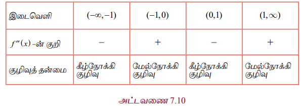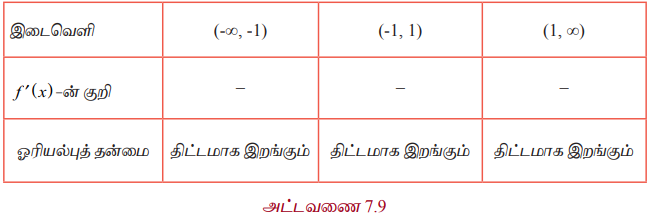 ஆகவே, x = -1,1-ல் f(x) காணத்தக்கது அல்ல. எனவே, x = -1,1 ஆகியவை நிலை எண்களாகும். ஓரியல்பு இடைவெளிகளை அட்டவணை 7.9-ல் அட்டவணைப்படுத்தப்பட்டு உள்ளது.