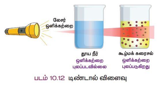 ஒரு வலுவான ஒளிக்கற்றையை கூழ்மக் கரைசலின் வழியே செலுத்தும்போது ஒளிக்கற்றையின் பாதையை பார்க்க முடியும் என்பதைடிண்டால் (1869)