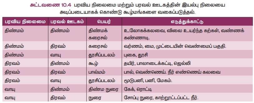 அட்டவணை 10.4 பரவிய நிலைமை மற்றும் பரவல் ஊடகத்தின் இயல்பு நிலையை அடிப்படையாகக் கொண்டு கூழ்மங்களை வகைப்படுத்தல்.