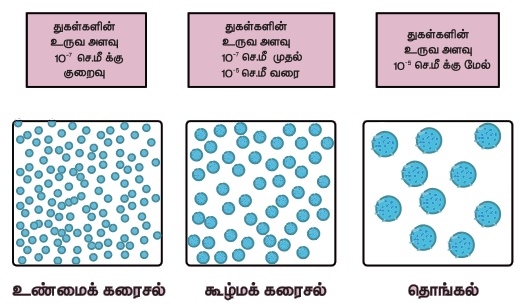 கரைசலில் உள்ள கரைப்பொருள் துகள்களின் அளவைப் பொறுத்து, கரைசல்கள் மூன்று வகைப்படும். அவ் வகைப்பாட்டினை ஒரு செயல்பாட்டின் மூலம் நாம் அறிவோம்.