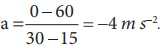மேலும் துகள் 15 வினாடியிலிருந்து 30 வினாடி வரை மாறாத எதிர்க்குறி சாய்வினைக் கொண்டுள்ளது. இந்நிகழ்வில் v2 = 0 மற்றும் v1 = 60ms-1. எனவே t = 20 வினாடியில் முடுக்கமானது