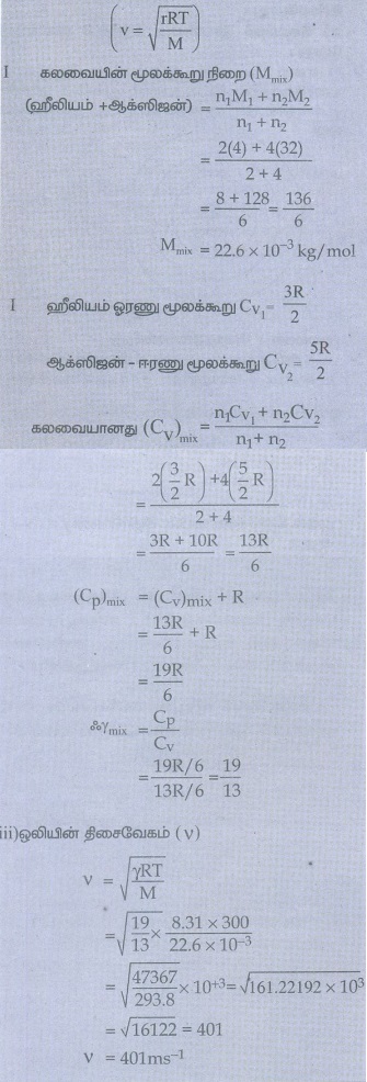 2. 2 மோல் ஹீலியம், 4 மோல் ஆக்சிஜன் கலந்த கலவையைக் கருதுக. இந்தக் கலவையில் 300K வெப்பநிலையில் ஒலியின் வேகத்தைக் காண்க.