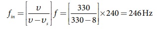 கேட்பவர் ஒருவர் தொடர்வண்டி நிலைய நடை மேடையில் நின்று கொண்டு இரண்டு தொடர் வண்டிகளை நோக்குகிறார். ஒன்று நிலையத்தை நோக்கியும், மற்றொன்று நிலையத்திலிருந்து வெளிநோக்கியும் சம திசைவேகம் 8 ms-1 ல் செல்கின்றன. இரண்டு தொடர் வண்டிகளும் வெளியிடும் விசில்களின் அதிர்வெண் 240 Hz எனில், கேட்பவர் உணரும் விம்மல்களின் எண்ணிக்கை யாது?