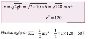 மாறாக 4 m உயரத்தில் பொருளின் திசைவேகத்தில் இருந்தும் இயக்க ஆற்றலைக் காணலாம். 6 m வீழ்ந்த பிறகு உள்ள திசைவேகத்தை இயக்கச் சமன்பாட்டிலிருந்து கணக்கிடலாம்.