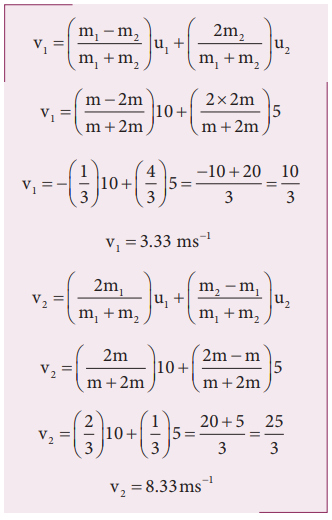 v1 மற்றும் v2 ஆகிய இரு வேகங்களும் நேர்க்குறியாக உள்ளதால் அவை இரண்டும் முறையே 3.33 ms-1 மற்றும் 8.33 ms-1 என்ற திசைவேகங்களுடன் மோதலுக்கு முன் இயங்கிய திசையிலேயே இயங்குகின்றன.
