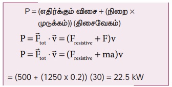 1250 kg நிறையுள்ள ஒரு வாகனம் ஒரு சமமான நேர் சாலையில் 0.2ms-2 முடுக்கத்துடன் 5OON என்ற எதிர்க்கும் புறவிசைக்கெதிராக இயக்கப்படுகிறது. வாகனத்தின் திசைவேகம் 30ms-1 எனில் வாகனத்தின் இயந்திரம் வெளிப்படுத்தும் திறனைக் கணக்கிடுக.