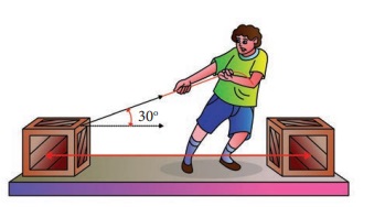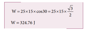 ஒரு பெட்டி 25 N விசையினால் 15 m இடப்பெயர்ச்சி ஏற்படுமாறு இழுக்கப்படுகிறது. விசைக்கும் இடப்பெயர்ச்சிக்கும் இடையே உள்ள கோணம் 30° எனில் விசையினால் செய்யப்பட்ட வேலையைக் காண்க.