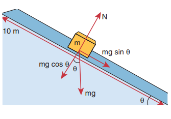 படத்தில் காட்டியுள்ளவாறு நிறை m = 1 kg கொண்ட ஒரு பொருள் θ = 30° சாய்வுக்கோணம் கொண்ட 10 m நீளமுள்ள உராய்வற்ற தளத்தில் மேலிருந்து கீழ்நோக்கிச் சறுக்குகிறது. புவியீர்ப்பு விசை மற்றும் செங்குத்து விசையினால் பொருளின் மீது செய்யப்பட்ட வேலையைக் கணக்கிடுக. புவியீர்ப்பு முடுக்கம் (g) = 10 m s−2 எனக் கருதுக.