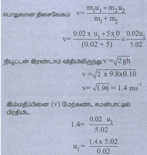 5. 20g நிறை கொண்ட ஒரு துப்பாக்கி குண்டு 5kg நிறையுள்ள ஊசல் குண்டில் மோதுகிறது. ஊசலின் நிறையின் மையம் 10cm செங்குத்துத் தொலைவு உயருகிறது. துப்பாக்கி குண்டு ஊசலில் பொதிந்து விட்டால் அதன் தொடக்க வேகத்தைக் கணக்கிடுக.