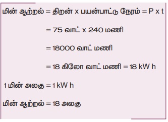 பயன்பாட்டு நேரம் t = 8 மணி × 30 நாட்கள் = 240 மணி. நுகரப்பட்ட மின் ஆற்றலானது திறன் மற்றும் பயன்பாட்டு நேரம் ஆகியவற்றின் பெருக்கல் பலன் ஆகும்.