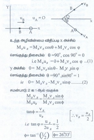 4. A மற்றும் B என்ற இரு நிறை தெரியாத வெவ்வேறு பொருள்கள் மோதிக் கொள்கின்றன. தொடக்கத்தில் பொருள் A ஒய்வு நிலையிலும் B ஆனது v வேகத்தையும் கொண்டுள்ளது. மோதலுக்குப் பின் பொருள் B ஆனது v/2 என்ற வேகத்தைப் பெற்று அதன் ஆரம்ப இயக்க திசைக்கு செங்குத்தாகச் செல்கிறது. மோதலுக்குப் பின் பொருள் A செல்லும் திசையைக் காண்க.