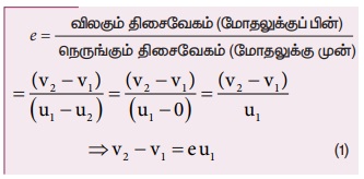 ஒரு மீட்சியற்ற மோதலில் ஒரு பொருள் நிலையாக உள்ள போது சமநிறைகள் கொண்ட பொருள்களின் திசைவேகங்களின் விகிதம் v1/v2 = 1-e/1+e எனக் காட்டுக.