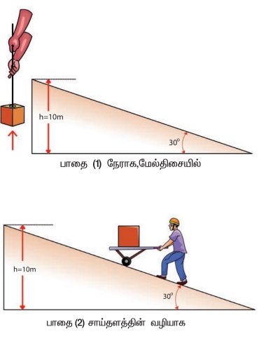 படத்தில் காட்டியுள்ளவாறு 100 kg நிறையுள்ள ஒரு பொருள் தரையிலிருந்து 10 m உயரத்திற்கு இரு மாறுபட்ட வழிகளில் தூக்கப்படுகிறது. இரு நேர்வுகளிலும் புவியீர்ப்பால் செய்யப்பட்ட வேலை என்ன? சாய்தளத்தின் வழியாக பொருளை எடுத்துச் செல்வது எளிதாக உள்ளது ஏன்?