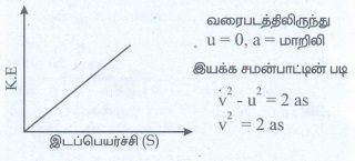 4. கார் ஒன்று ஒய்வு நிலையில் இருந்து ஒரு பரப்பில் சீரான முடுக்கத்துடன் இயங்குகிறது. இயக்க ஆற்றல் இடப்பெயர்ச்சி வரைபடம் வரைக. அந்த வரைப்படத்திலிருந்து நீ பெறக்கூடிய தகவல்கள் யாவை?