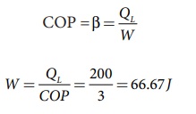 குளிர்சாதனப்பெட்டி ஒன்றின் COPயானது 3 ஆகும். 200 J வெப்பத்தை குளிர்சாதனப்பெட்டியிலிருந்து வெளியேற்ற வேண்டுமெனில் எவ்வளவு வேலை செய்யப்பட வேண்டும்?