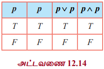 மேற்கண்ட மெய்மை அட்டவணையில் p, p ∨ p மற்றும் p ∧ p ஆகியவைகள் ஒரே மெய் மதிப்புகளைப் பெற்றுள்ளது. எனவே, p ∨ p ≡ p மற்றும் p ∧ p ≡ p