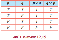 p ∨ q மற்றும் q ∨ p களின் மெய் மதிப்புகள் ஒரே மாதிரியாக உள்ளன. எனவே, p ∨ q ≡ q ∨ p. இதேபோல, (ii) p ∧ q ≡ q ∧ p என நிரூபிக்கலாம்.