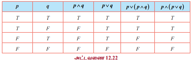 (ii) மெய்மை அட்டவணையில் p ∧ ( p ∨ q ) மற்றும் p ஆகியவற்றிற்கான நிரல்கள் முழுவதும்ஒரே மாதிரியாக உள்ளன. எனவே அவை சமானமானவை.