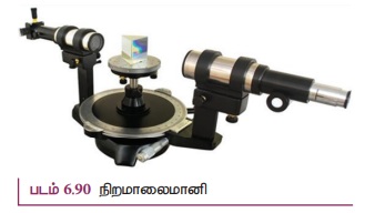 பல்வேறு ஒளி மூலங்களிலிருந்து வரும் நிறமாலைகளை ஆராயவும், பொருள்களின் ஒளிவிலகல் எண்களைக் கணக்கிடவும் நிறமாலைமானிகள் பயன்படுத்கின்றன. நிறமாலைமானி ஒன்று படம் 6.90 இல் காட்டப்பட்டுள்ளது. அடிப்படையில் நிறமாலைமானி மூன்று பகுதிகளைக் கொண்டுள்ளது. அவை முறையே இணையாக்கி, முப்பட்டக மேடை மற்றும் தொலைநோக்கி ஆகும்.