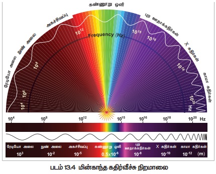 மின்காந்த கதிர்வீச்சு நிறமாலையில் புலனாகும் ஒளிக்கதிர்களடங்கிய பகுதி மிகவும் சிறிய பகுதி மட்டுமே. இப்புவியின் ஒட்டு மொத்த உயிர் வாழ்க்கை ஒளியை சார்ந்தே உள்ளது. மேலும் இதுவே உந்துசக்தியாகவும் உள்ளது. தாவரங்கள் இயற்கையாகவே சூரிய ஆற்றலை நேரடியாக பயன்படுத்தும் திறன் பெற்றவை. இங்கே கொடுக்கப்பட்ட படத்தில் (13.4) மின்காந்த கதிர்வீச்சு நிறமாலை மற்றும் ஒளியின் புலனாகும் ஒளிக்கதிர்களடங்கிய பகுதிகள் குறிப்பிடப்பட்டுள்ளது. 300 முதல் 2600 nm அலைநீளமுள்ள சூரிய கதிர்வீச்சு பூமியை வந்தடைகிறது. இதில் புலனாகும் நிறமாலையின் அளவு 390 to 763 nm (3900Å முதல் 7630Å) அலைநீளமே ஒளியின் நிறத்தை தீர்மானிக்கிறது. ஒளியின் ஆற்றலானது அதன் அலை நீளத்திற்கு எதிர் விகிதப் பொருத்தத்தில் உள்ளது. குறுகிய அலைநீளமுடையது குறைந்த ஆற்றலை கொண்டிருக்கிறது. மின்காந்த நிறமாலையானது 7 வகையான கதிர்வீச்சை பெற்றுள்ளது. இவை முறையே காஸ்மிக் கதிர்கள், காமா கதிர்கள் , X- கதிர்கள், U-V கதிர்கள், புலனாகும் மின்னியக் கதிர்கள் மற்றும் ரேடியோ கதிர்வீச்சு (படம் - 13.4).