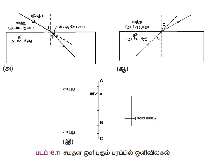 அடர் மிகு ஊடகத்திலிருந்து அடர் குறை ஊடகத்திற்கு ஒரு ஒளிக்கதிர் செல்லும்போது குத்துக்கோட்டை விட்டு விலகிச் செல்கிறது (6.11ஆ).