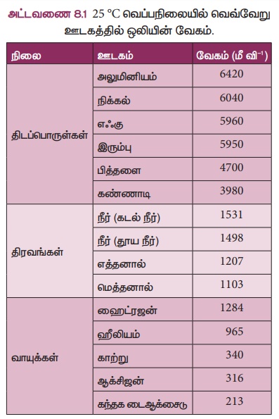 25°C வெப்பநிலையில் 34 மீவி-1 ஆகும். ஒரு குறிப்பிட்ட வெப்பநிலையில் வெவ்வேறு ஊடகத்தில் ஒலியின் வேகம் அட்டவணை 8.1 ல் கொடுக்கப்பட்டுள்ளது.