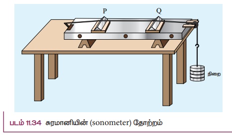 சுரமானி என்பது ஒரு மீட்டர் நீளமுள்ள ஒரு மரப்பெட்டி அதன் மீது சீரான உலோகக்கம்பி பொருத்தப்பட்டிருக்கும். கம்பியின் ஒரு முனை ஒரு கொக்கியுடனும், மறுமுனை ஓரு உருளை கப்பி வழியே ஓர் நிறைத்தாங்கியுடனும் படம் 11.34 ல் காட்டியவாறு இணைக்கப்பட்டுள்ளது. கம்பியின் இழுவிசையை அதிகரிக்க மறுமுனையில் நிறைகள் சேர்க்கப்படுகிறது. இரண்டு நகர்த்தக் கூடிய கூர் முனைகள் கம்பியை கீழே தொட்டவாறு சுரமானியின் பலகை மீது வைக்கப்பட்டுள்ளன. அவற்றிற்கிடையேயானத் தொலைவை மாற்றி அதிர்வுறும் கம்பியின் நீளத்தை மாற்றலாம்.